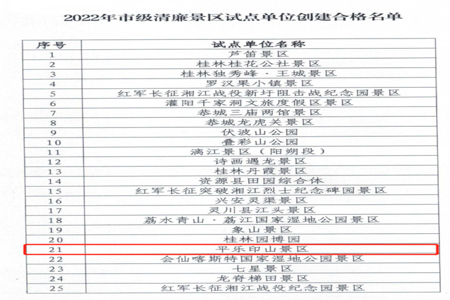 ƾ֤¡¶¹ðÁÖÊÐÇåÁ®¾°Çø£¨ÊԵ㡢Ê÷Ä££©ÆÀ¶¨ÊµÑé²½·¥£¨ÊÔÐУ©¡·ºÍ¡¶¹ØÓÚ¿ªÕ¹ÇåÁ®¾°ÇøÆÀÉóôß¼¨Ð§¿¼ÆÀÊÂÇéµÄ֪ͨ¡·ÒªÇ󣬯½ÀÖºëÈó¹«Ë¾Ó¡É½ÂÃÓÎÂëÍ·¾°ÇøÍ¨¹ýÏà¹ØÆÀ¶¨Á÷³Ì£¬ÀÖ³ÉÈëÑ¡2022Äê¶ÈÊм¶ÇåÁ®¾°ÇøÊ÷Ä£µ¥Î»...