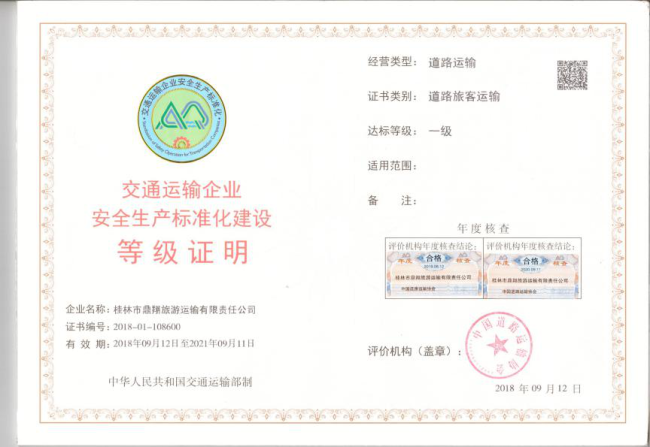 克日,受交通运输部委托中国蹊径运输协会专家评定小组对鼎翔旅游公司清静生产标准化建设一级达标举行2020年度核查,鼎翔旅游公司顺遂通过此次年度核查。清静生产标准化年度核覆按评事情是2020年鼎翔旅游公...