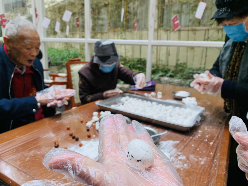 填馅、裹粉、包汤圆……欢声笑语中,一个个胖乎乎的汤圆成型,老人吃着自己亲手包的汤圆,眼角的细纹笑成了幸福的弧度。在猜字谜环节,尊长们三两成群,跃跃欲试,仔细阅读谜面,讨论着谜底,在拿到料中字谜的“战利品”后,尊长们笑的像个孩子。
