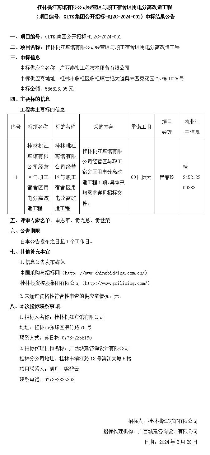 桂林桃江宾馆有限公司谋划区与职工宿舍区用电疏散刷新工程 (项目编号:GLTK集团果真招标-DJZC-2024-001)中标效果通告