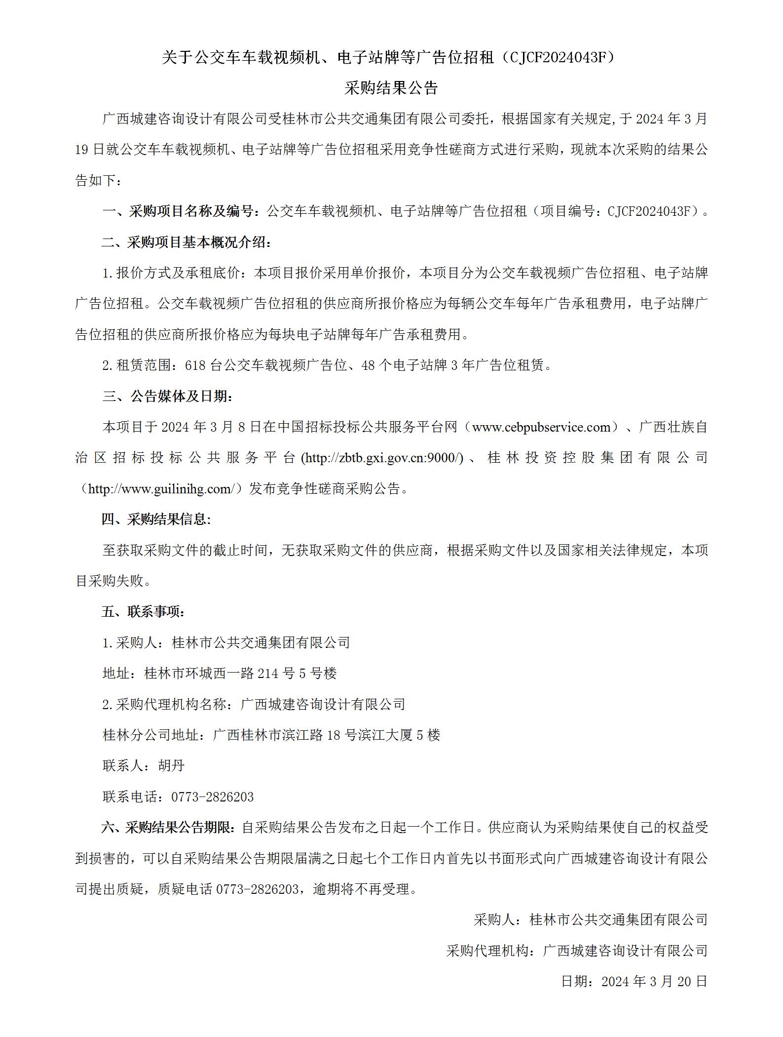 关于公交车车载视频机、电子站牌等广告位招租(CJCF2024043F) 采购效果通告