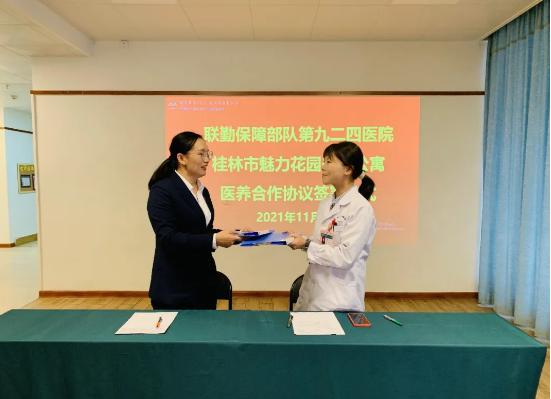 为增进医养团结生长,日前魅力花园(桂林交控)国际养老公寓与中国人民解放军联勤包管步队第九二四医院签署了《服务住民恒久义诊运动协议书》,以后第九二四医院将为魅力花园养老公寓晚年人开通就诊绿色通道,并未必期为魅力花园老人们开展慢病诊治、照顾护士指导、重症转诊、疾病防控和宣教等专家惠民医疗服务 。