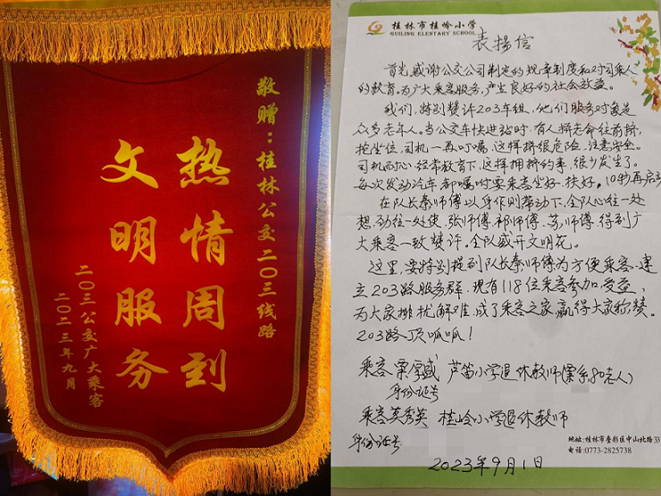 克日,退休西席莫姨妈同她的邻人粟姨妈一起来到桂林公交,把印有“热情周密,文明服务”字样的锦旗送到始发站场站清静服务部值班职员手上。
