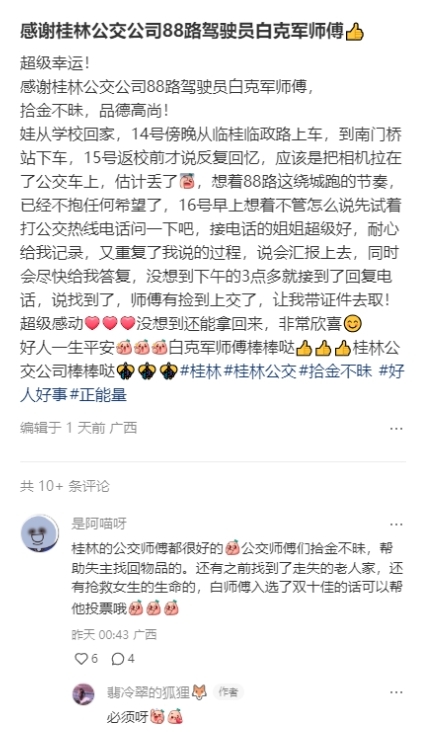 ÊÂÇéÒª´Ó12 ÔÂÖÐÑ®µÄÒ»Ìì»Æ»èÌá¼°¡£½¯Å®Ê¿µÄº¢×Ó´ÓÁÙ¹ðÁÙÕþ·³Ë×ø88·¹«½»³µ£¬ÔÚÄÏÃÅÇÅվϳµÊ±Ê§É÷½«Ïà»úÒÅÂäÔÚ³µÉÏ¡£ÊÂÇ鱬·¢ºó£¬½¯Å®Ê¿±§×ÅÊÔÊÔ¿´µÄÐÄ̬²¦´òÁ˹«½»ÈÈÏߣ¬ÊÂÇéÖ°Ô±ÈÈÇé½Ó´ý²¢Ïêϸ¼Í¼ÁËÏà¹ØÐÅÏ¢¡£µ±ÌìÏÂÖ磬½¯Å®Ê¿¾Í½Óµ½Á˹ðÁÖ¹«½»ÊÂÇéÖ°Ô±µÄµç»°£¬ËµÏà»úÒÑÕÒµ½¡£ÔÀ´£¬88·¹«½»³µ¼ÝʻԱ°×¿ËÖÇÄÒ¸µÔÚ³µÁ¾»Ø³¡¼ì²éʱ·¢Ã÷ÁË×ùÒÎÉϵÄÏà»ú°ü¼°ÄÚÀïµÄµ¥·´Ïà»ú£¬ËæºóʵʱÉϽ»¼ÓÈëÕ¾ÖÎÀíÖ°Ô±´¦±£¹Ü¡£Ïà»úʧ¶ø¸´µÃÈý¯Å®Ê¿ºÜ¸ÐÉË£¬ÓÚÊÇÔÚ¡°Ð¡ºìÊ顱дÏÂÁ˶Թ«½»³µÊ¦¸µµÄÔÞÃÀºÍлл¡£